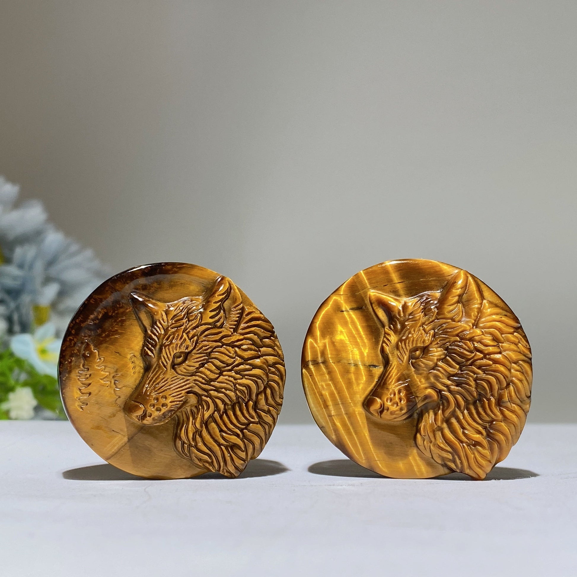 1.6" Yellow Tiger Eye Wolf Head Round Slab Carving Crystal Healing Bulk Wholesale